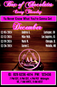 Mike-McD. speaking at the Box of Chocolates meeting on Dec 12 2024 AA - Alcoholics Anonymous December 12, 2024 SearchSubmitClearThe Recovery Speakers team is able to share and continue this work solely through donations from our users and supporters. Please consider a donation.Latest Posts Paul W. at the Cornhusker Roundup on 8/13/2014 February 15, 2026Bob B. from St. Paul, MN at Colorado State Convention – Denver, CO – 8/31/2001 February 14, 2026Bill W. – How We Learned To Recover – at the 1955 International Convention February 13, 2026Tim H. from Louisville, KY @ Miracles at Lake Murray – Lake Murray, OK 9/9-11/2016 February 12, 2026June G. from Los Angeles, CA at Area 53 General Service Convention – 9/9/1994 February 11, 2026